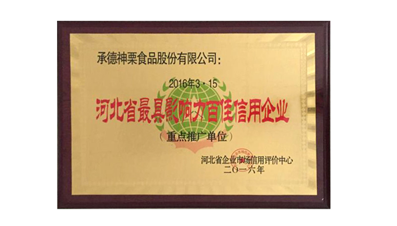 27、2016年3月15日 承德神栗食品股份有限公司被河北省企業(yè)市場信用評價中心評為2016年3.15 “河北省最具影響力百佳信用企業(yè)”重點推廣單位