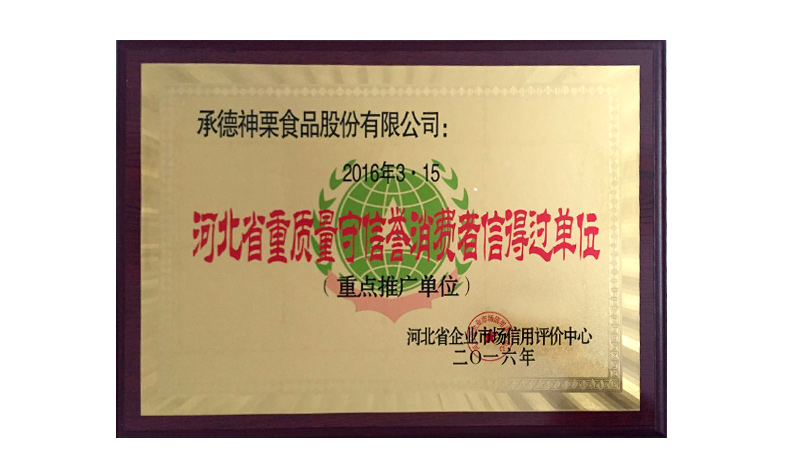 3、2011年神栗公司被河北省評為:質(zhì)量過硬信譽良好消費者滿意單位。