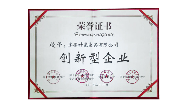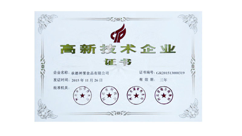 24、2015年11月26日 承德神栗食品有限公司獲得“高新技術(shù)企業(yè)”證書