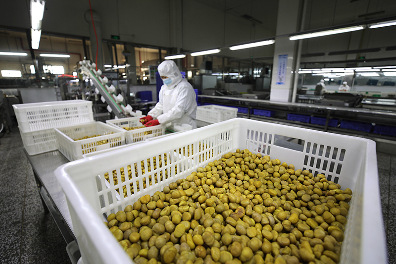 3月18日,在寬城滿族自治縣一板栗深加工企業(yè),員工在板栗仁加工生產(chǎn)線上忙碌。